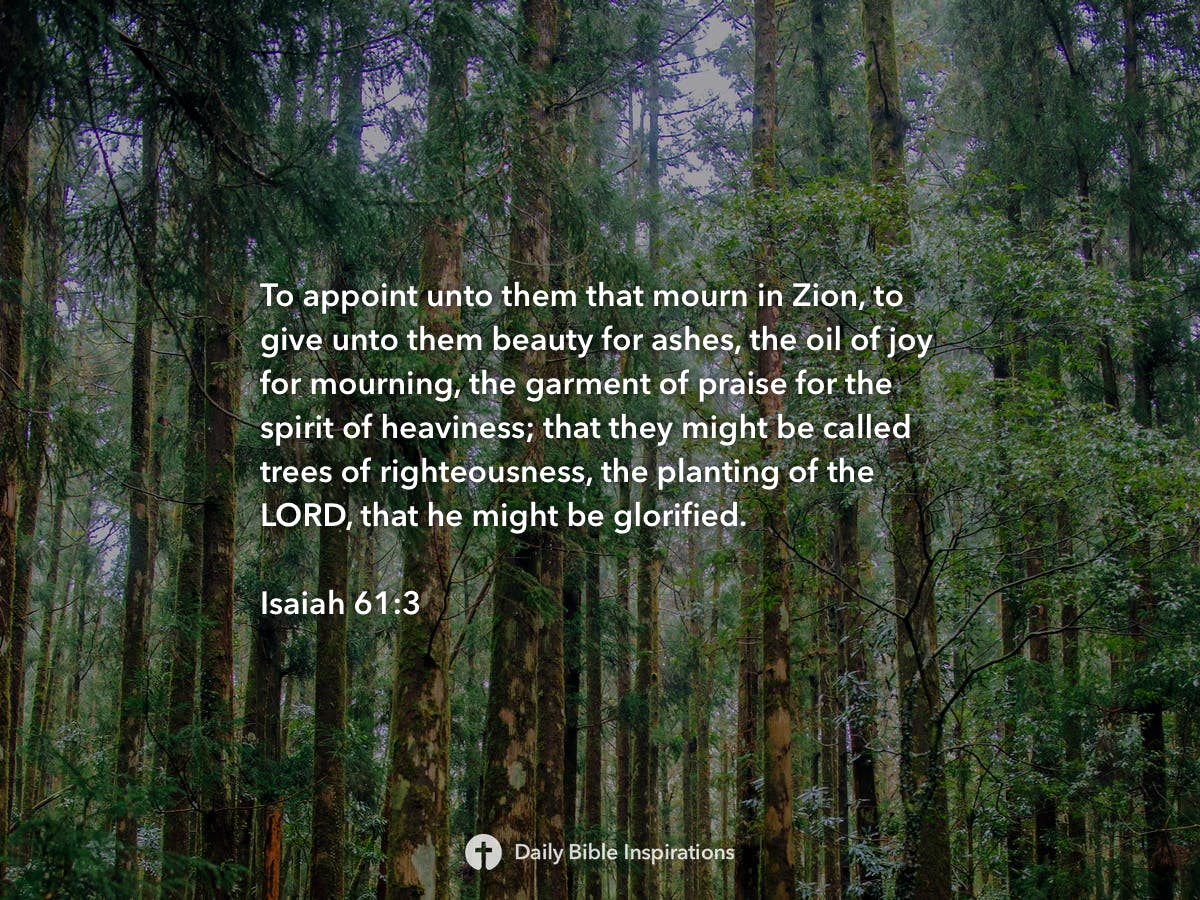 The hebrew word for beauty used here refers to a headdress, turban, or tiara. How do you create beauty for ashes of what feels like your life? Heck, i'm there right now. You know like gotten to that place where everything beautiful in life just faded to a dim place of nonexistence in comparison to … Have you ever lost your aim for living? Oh my sisters in christ, how i love this verse! That they may be called oaks of righteousness, the planting of the lord , that he may be glorified. The spirit of the sovereign lord is on me, because the lord has anointed me to. They will be called oaks of righteousness, a planting of the lord for the display of his splendor. 15.05.2021 · the phrases in isaiah 61:3 make the meaning of this verse even more powerful. And let's face it… we've all been there. Verse (click for chapter) new international version and provide for those who grieve in zion— to bestow on them a crown of beauty instead of ashes, the oil of joy instead of mourning, and a garment of praise instead of a spirit of despair. New living translation to all who mourn in israel, he.
